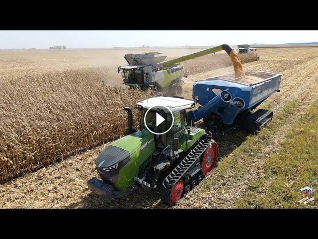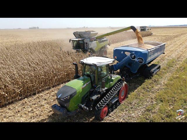 In this video I am out in the field with On Track Farming from the Gibson City Illinois area as they are busy harvesting their 2021 corn crop. In this video you will see lots of actions as they harvest corn with their two Claas Lexion 8800 combines with 16 row Gerringhoff heads. Hauling the corn from the combines to the trucks is 3 Kinze grain carts being pulled with a Fendt Vario MT 943, A Challenger MT865C and a Cat MT865 track tractors.