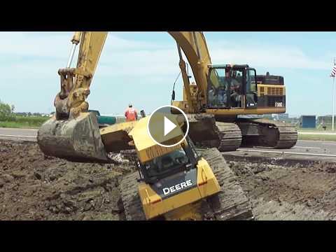 We were trying to finish grade the slopes along a new highway when the 650H slid down the slope into the canal and the 750J tried to pull him out, an also fell in. Good thing we had the 345CL there to rip them both out.