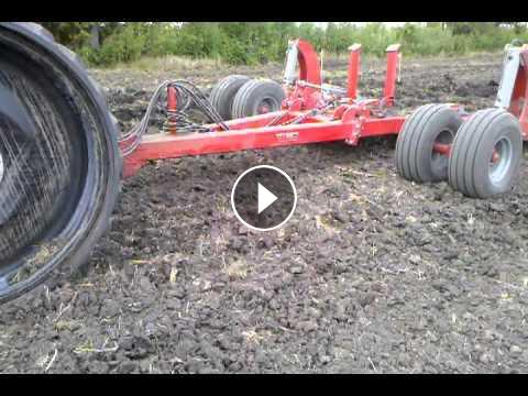 Watch the 5-knife, 37 inch deep, de-compaction of this property which had been compacted by heavy equipment traffic during pipeline construction. Use of this deep ripper on other pipeline rights-of-ways and strip-mined lands has resulted in significant crop yield improvements. Notice the wave lifted in front of the implement, the height of the lift remaining after it passes, and the cracks created by the knives as well as those perpendicular to the direction of travel.