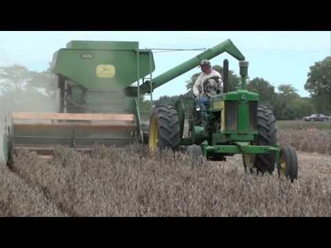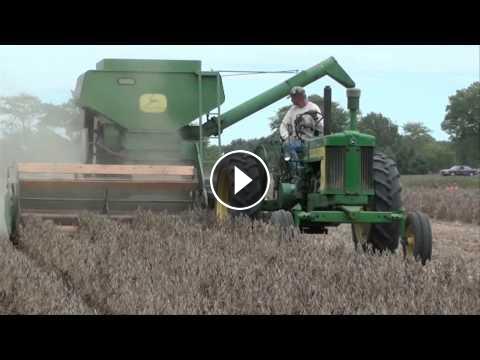 Combining soybeans with old machinery. Older John Deeres & an Oliver. Taped at the Geneseo , Ill. Steam Show. Sept. 2011