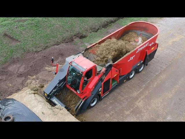 July 24, 2020 - Silage cutting, mixing and feeding to cattle with the Trioliet Triotrac 2-2000 self-propelled TMR mixer, a demonstration machine.