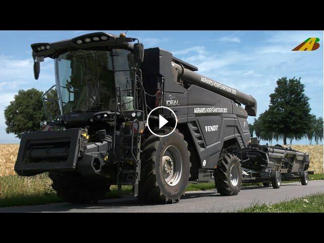 Fendt demonstration tour 2021 with a Fendt Ideal 7 combine harvester at the farmer near Hamburg. There is also the Fendt Ideal 8, 9, 9T and the Fendt Ideal 10T without a steering wheel. The T stands for caterpillar drive.