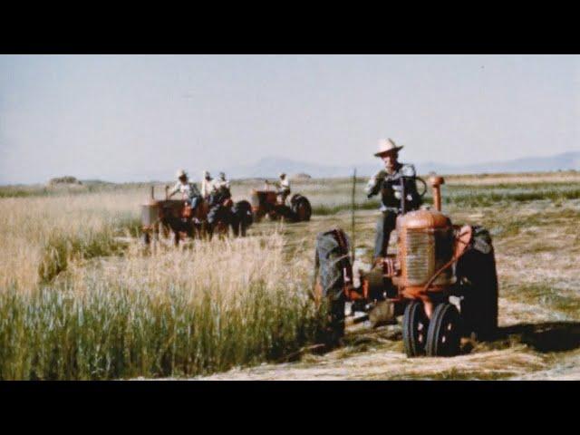 The era following World War II was the time of transition from horse-drawn to motor-driven machinery. In the footage of haying, some horse-drawn equipment, including the derrick itself, has simply been attached to a tractor or jeep. Mechanization of this sort does not offer much of a reduction in labor; the next generation of machines, designed to work with internal combustion engines, enabled ranchers to cut back on hired help. Les's narration explains how the work is organized and directed. In the opening section of the film, he notes that scheduling haying between major holidays reduces the likelihood of losing the crew to celebratory drunkenness. The hierarchy of workers is implied in his comments about the lead mower and the stack boss.