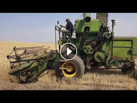 1954 John Deere 55H combine. John Deere's first production self propelled Hillside combine! Brings back such great memories of combining soy beans with my pop back in 1969. My pop and me (I was 12) rebuilt a John Deere 55 with a Hercules Engine. Fresh coat of John Deere green pepper paint, new belts and new wood on the header. It was a beauty. Pop let me operate while he walked behind to see if we lost to much beans. I will never forget those days. We combined soy beans, rye and corn (with a corn header bought at an auction). I enjoyed those days with my pops and thank the good Lord for every minute!
