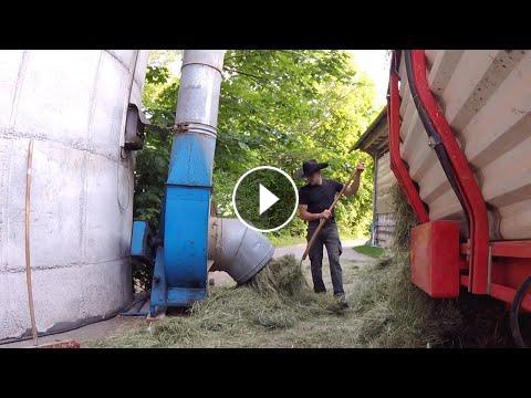 We use hay blower to get the hay up in the hayloft. At the end is a swiveling pipe that spreades the hay evenly. We didn't really have sunny weather for drying hay outside so we will further dry it with drying machine.