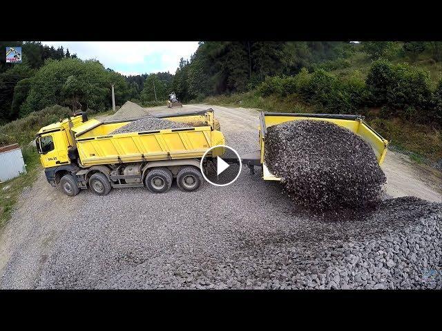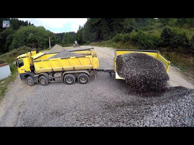 Trucks Mercedes-Benz Arocs 8x6 and Tatra Phoenix 8x8 with Meiller-kipper tandem trailers unload stone.
