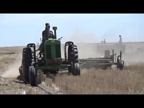This is a video of antique tractors pulling one way disc plows to work a quarter of wheat stubble.