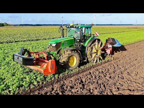 The tractor is a JOHN DEERE 6195R with an six furrow Kuhn Vari Master L on land/ in furrow plough.