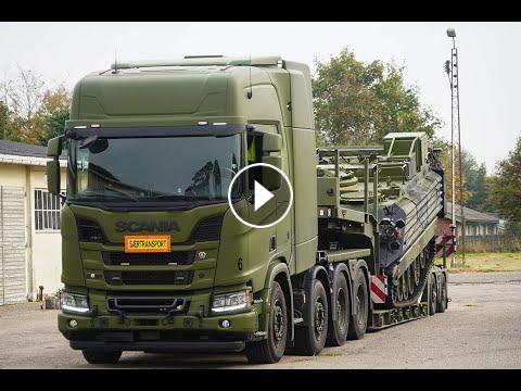 Scania V8 R650 Highline 8x4/4 Heavy Military Transport - Transporting M113 APC - SCANIA TRUCKS Chassis Frame ■ Scania F950, 270 x 90 x 9.5mm ■ Width 770mm Paint ■ Scania Sub-Grey (Powder Coat) Axle Distance ■ 3150mm (3825mm wheel base) ■ Rear overhang 1636mm FUEL & UREA TANKS ■ 1030L (1x710L L/H, 1x320L R/H) ■ 1x73L Urea tank R/H Front Bumper ■ Normal FUP compliant bumper ■ FUP to ECE R93 Batteries ■ 24V (2x12V, 230amp) rear of chassis ■ Chassis electrical connection for auxiliary equipment (Max 200amps) Trailer Connections - Brakes ■ Trailer Supply & Emergency suzi coils Trailer Connections - Electrical ■ 12V & 24V trailer light outlets (ISO 1185) ■ Trailer lead 7pole to 7pole ■ 24V trailer 7pin ABS outlet ■ Scania Body Work System with Cable Harness ■ Front Mudguards with Spray suppression ■ Rear Mudguards with Spray suppression Cabin ■ Scania CR20N High Roof Sleeper cab with four point air suspension ■ Electric cab tilt ■ Cab Strength to ECE R29 Paint ■ Cab Painted Scania White With Brilliant Black grille ■ Cab colour bumper & front guards mirrors ■ Aerodynamic main & spotter mirrors electrically heated ■ Electrically adjustable main mirrors ■ Close up mirror on passenger side Exterior Equipment ■ Roof rails with full air foil kit ■ Roof mounted air horns ■ Electric roof hatch with mosquito net ■ Remote Central Locking ■ External storage compartments ■ Reverse Alarm Lighting ■ LED headlights ■ Day time running lights - White LED ■ End outline marker - White LED ■ Identification lights - White LED ■ Driving lights in roof ■ Driving lights in grille ■ Boarding step lights ■ Turntable light ■ Fog lights in bumper Safety ■ Driver seat belt pretensioner ■ Drivers steering wheel air bags ■ Driver and passenger side curtain air bag ■ Lane departure warning (LDW) ■ Electronic stabiliser program (ESP) ■ Advanced emergency braking (AEB) ■ Adaptive cruise control (ACC) Interior Equipment ■ Premium driver’s seat with armrest ■ Medium passenger seat ■ Black leather trim ■ Soft feel black/grey dash with centre storage and passenger table with dark chrome trim ■ Black leather steering wheel ■ With Cruise Control & Dash display controlled from steering wheel ■ Scania 7 inch colour dash display featuring rear axle load, hour meter, service and vehicle information ■ Premium 7 inch infotainment system ■ AUX MP3, input ■ Phone electrical preparation ■ 12V outlet in dash ■ FMS Preparation ■ Resettable Circuit breakers ■ Power Windows - Driver & Passenger ■ Automatic Climate Control with Air conditioning ■ Refrigerator/freezer under bunk ■ Lower Bed, extendable from 800mm to 1000mm ■ Upper Bed, 700mm ■ Curtains, Windscreen & Door, Bed ■ Protective rubber floor mats ■ UHF CB radio Additional Equipment ■ 20m Tyre inflation hose ■ Jack & wheel brace ■ Globe Kit ■ Drivers Manual ■ Three Safe