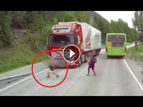 Boy comes within inches of being crushed to death by a huge lorry after running across the road without looking. Thanks to Volvo truck automatic braking.